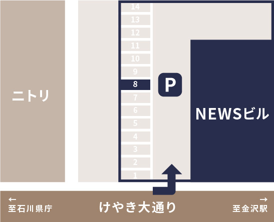 当事務所の駐車場は、ビル真横の駐車場の8番です。50メートル道路(けやき大通り)から進入して、駐車してください。裏通りからは駐車場に入ることはできないので、ご注意ください。